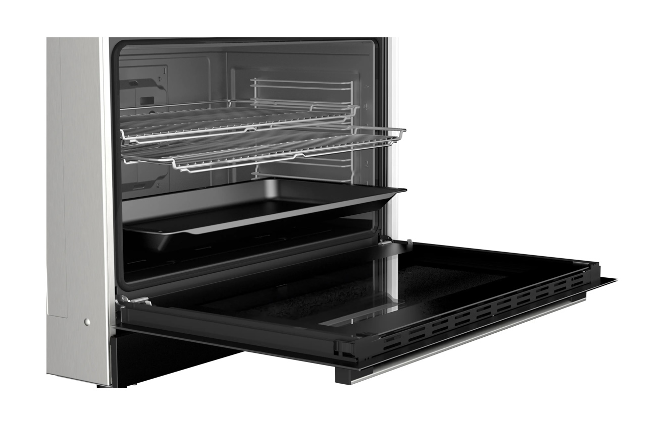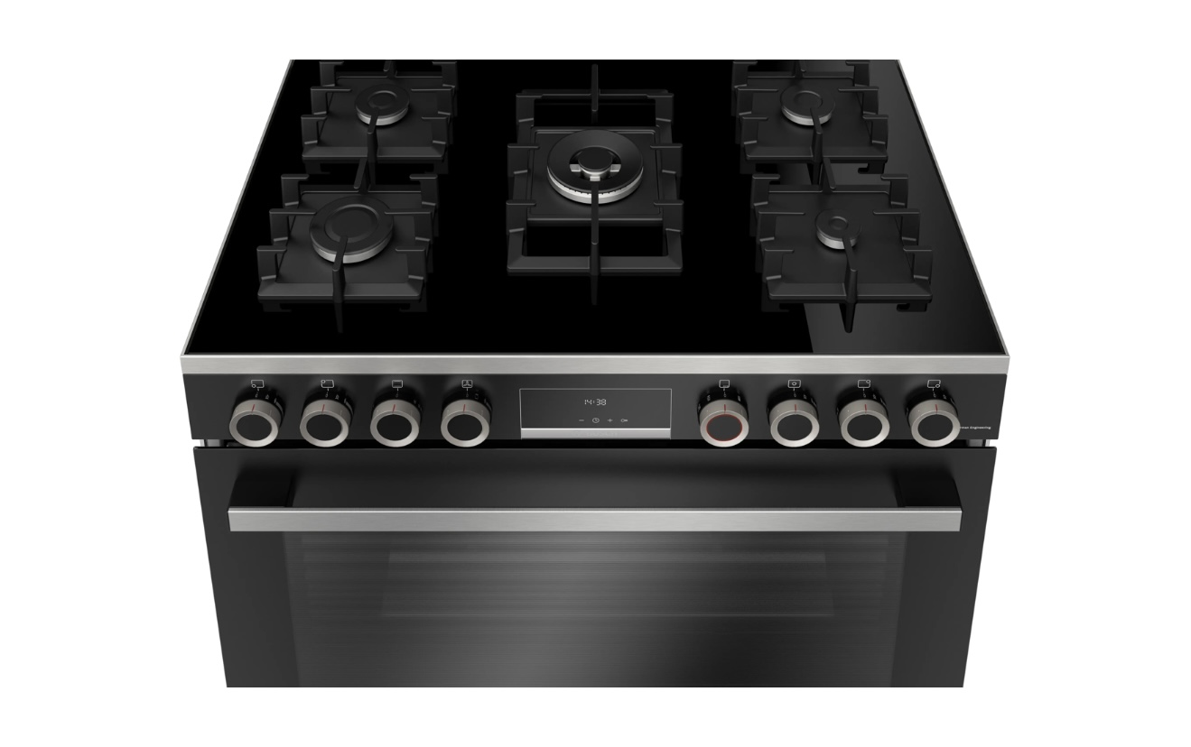 BOSCH SERIES 8 COOKER 90 * 60 CM 5 BURNERS CAST IRON DIGITAL SCREEN FULL SAFETY HJY5G7V61S Digital Touch Screen Retains heat and reduces odors for faster cooking. Tempered Glass Top: Elegant and easy-to-clean design. Equipped with a dual grill to grill two chickens at the same time with perfect results. Cast iron hobs provide extra support for your heavy pots. The full safety system automatically cuts off the gas supply to the hob and oven simultaneously. Full Glass Door: Supports quick and easy cleaning by removing the inner glass of the door. Stainless Steel Gas Hob: Its high-quality design allows you to enjoy cooking for longer