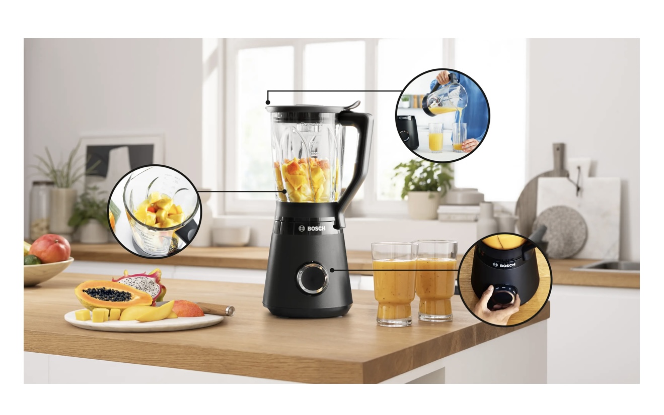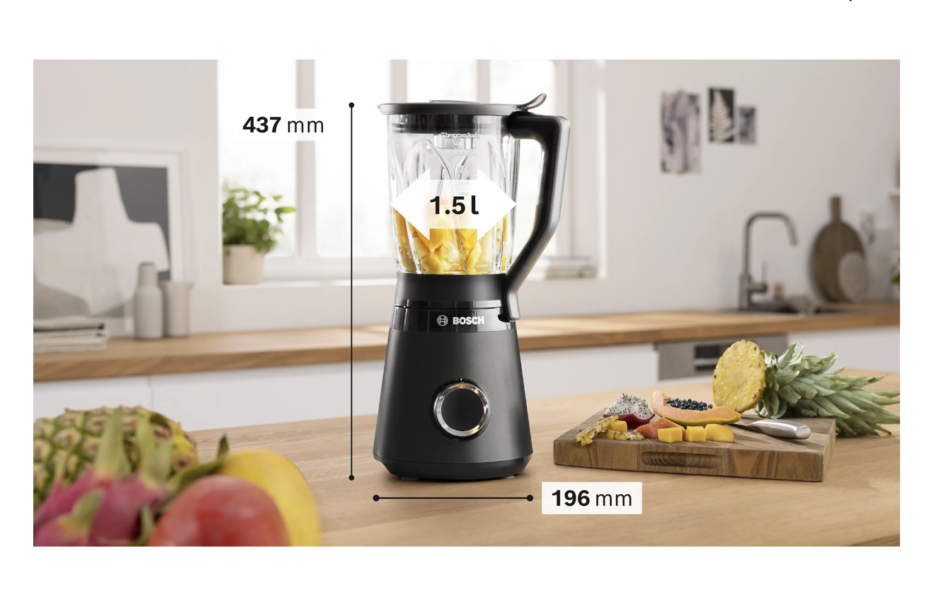 BOSCH BLENDER 1200 W GLASS JAR 1.5 BLACK MMB6172B Product dimensions: 410 x 230 x 195 mm Dimensions of the product with packaging (HxWxD): 305 x 288 x 395 mm Pallet dimensions (height x width x depth), cm: 200.0 x 80.0 x 120.0 Net weight: 4.1 kg Gross weight: 4.8 kg Power: 1200 W Voltage: 220-240 V Frequency: 50/60 Hz Length of the power cord: 100.0 cm Plug type: Gardy-/K plug without grounding